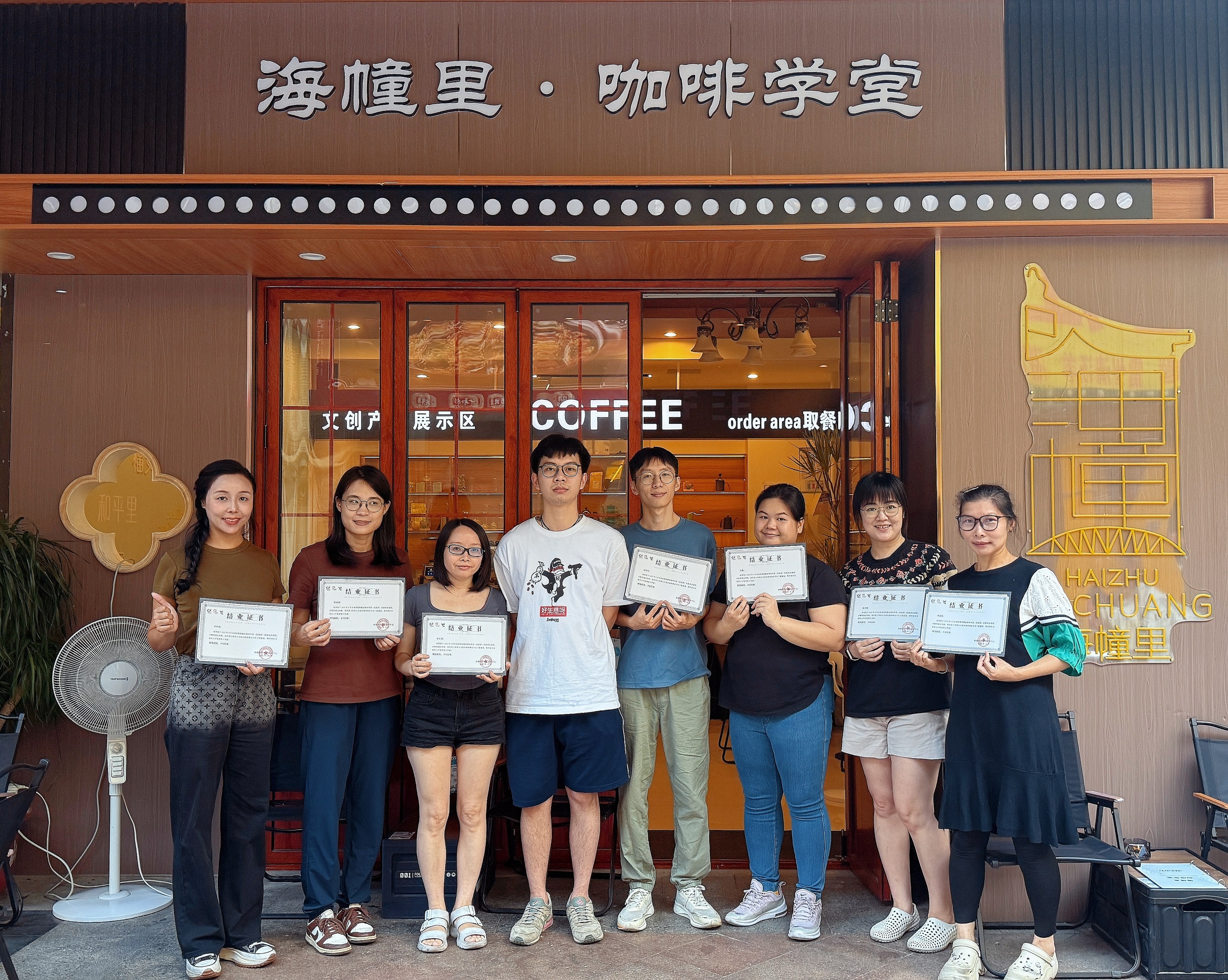除了优质课程,海幢里咖啡学堂还为学员提供“咖啡师职业技能培训—就业实训—创业孵化”全链条支持。学员完成全部课程并通过考核后,将获得相应的课程结业证书,部分表现优异的学员还将获得海幢里咖啡学堂的就业岗位或推荐至连锁咖啡品牌门店实习或就业。对于有创业意愿的学员,学堂也会提供相应的技术扶持和创业建议,鼓励学员从“社区咖啡角”“移动咖啡车”等轻资产创业项目入手,提升创业成功率。此外,学堂还将定期组织 “咖啡行业招聘集市”“冲调技能大赛”“拉花大赛”等,为学员与用人单位搭建对接、展示的平台。
